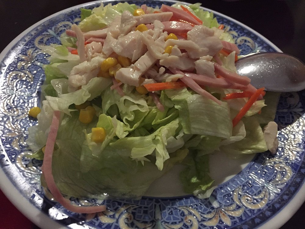 Ensalada fresca de lechuga con pollo, jamón, maíz y un aliño suave tradicional.